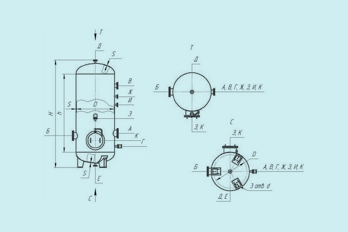 Воздухосборник-ресивер для хранения сжатого воздуха используют в производственных технологических циклах. Основное назначение – накопление сжатого воздуха, поступающего от компрессора, его хранение и выдача в технологическую линию: